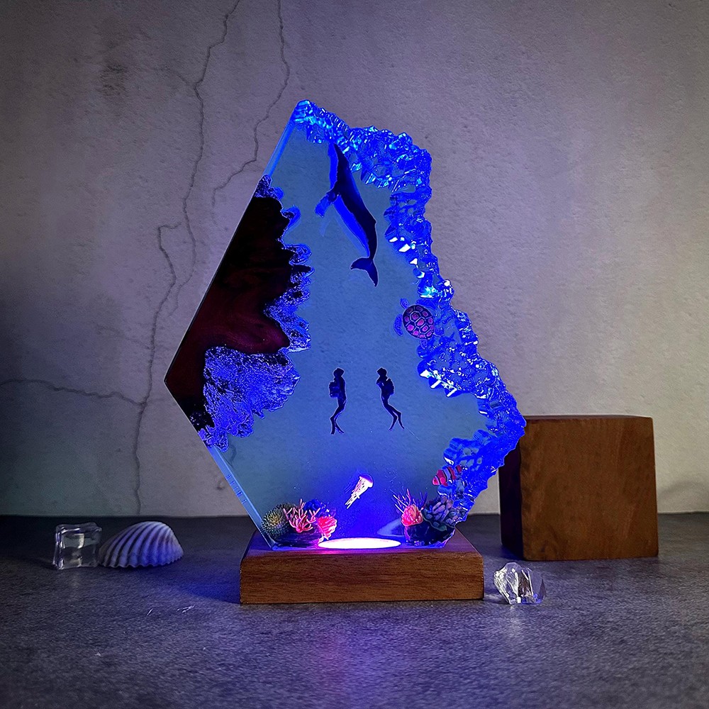 Holzlampe mit Buckelwal und Taucherpaar, Ozeanlampe aus Epoxidharz, tiefblaues Meer, Quallen und Nemo, individuelles Nachtlicht, Weihnachtsgeschenk