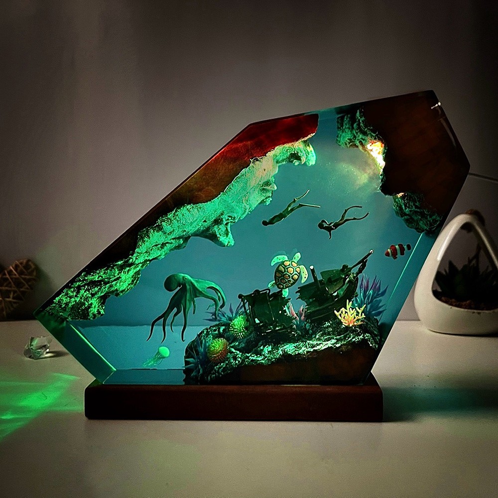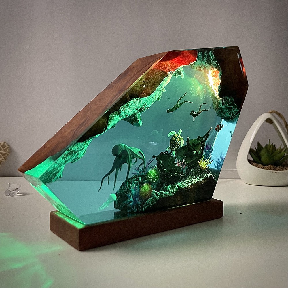 Nachtlicht aus Kunstharz mit Oktopus und Tauchern