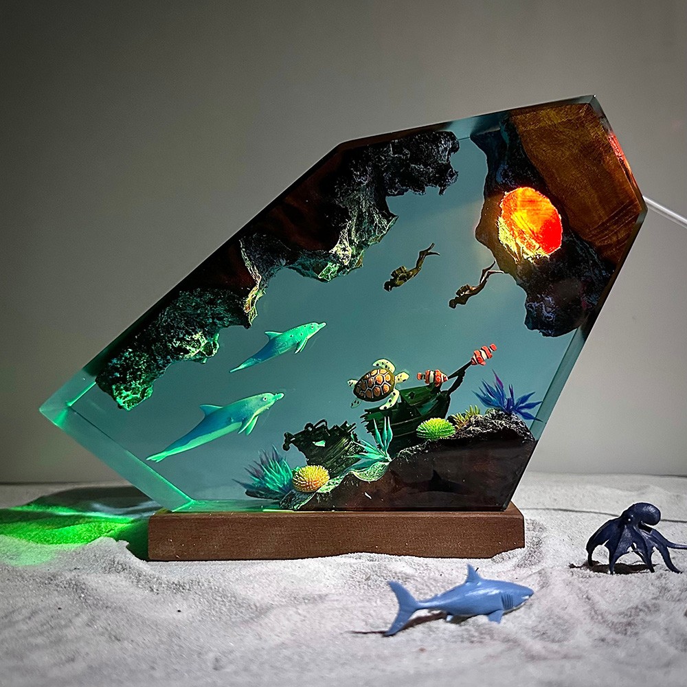 Lampe en résine dauphin et tortue, lampe de table, veilleuse en bois, résine océanique, lampe en résine de bois, cadeau pour amoureux, cadeau pour lui, cadeau pour elle