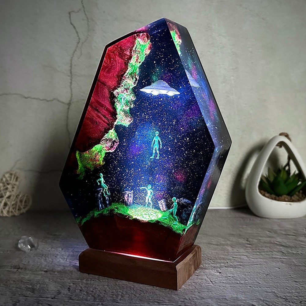 Embark on a mesmerizing journey as you gaze into the depths of this enchanting lamp. Suspended in a galaxy of epoxy resin, miniature astronauts float weightlessly, exploring the mysteries of interstellar space. Their presence sparks wonder and ignites your imagination, as if you've joined them on their cosmic odyssey.
