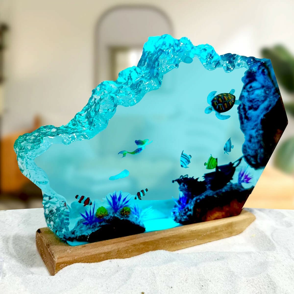La lámpara de resina de sirena y tortuga es el producto innovador, rompiendo todos los límites y diseño. Tomamos 12 días para crear esta lámpara de resina. También es la cristalización del arte, el tiempo, el talento, la paciencia y la meticulosidad. Las fotos no pueden describir completamente la belleza de esta lámpara.