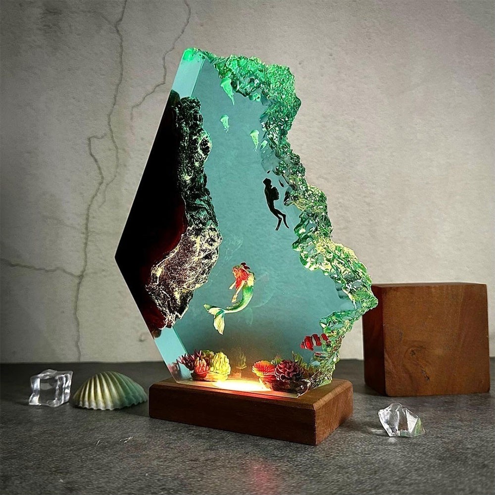 Mermaid buzos de luz nocturna, gran lámpara de madera de resina epoxi, buceo, buceo gratuito, mundos minúsculos, regalo de verano.