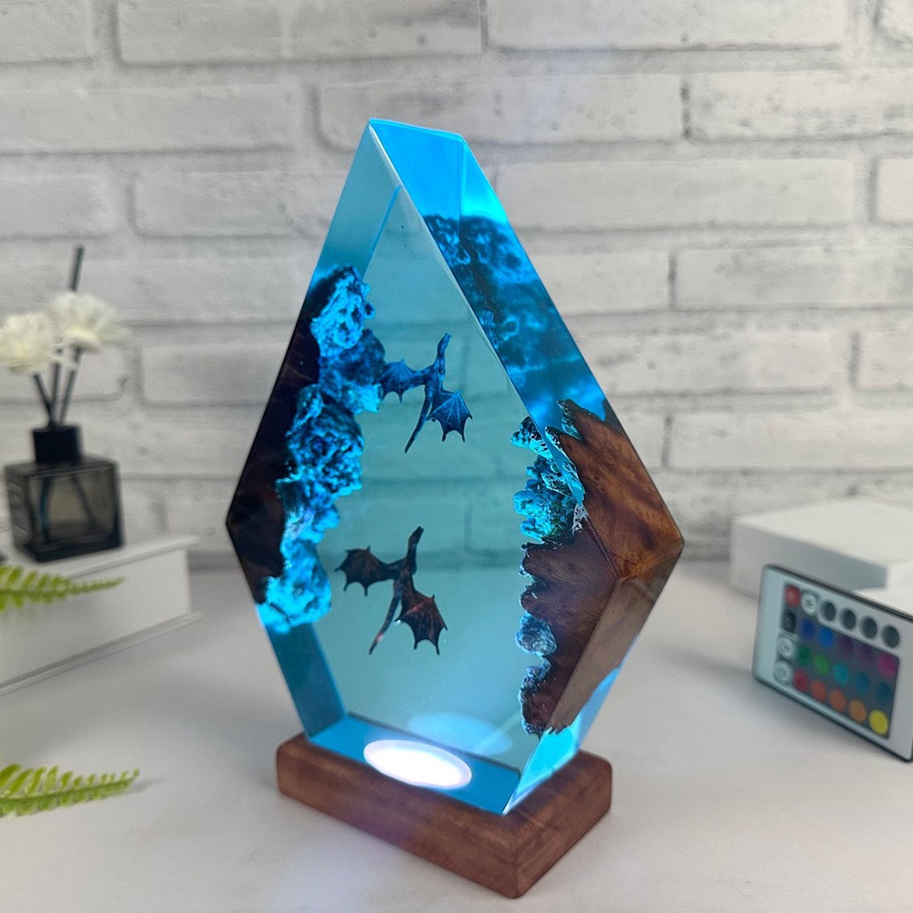 Esta lámpara de noche de resina presenta una vista mágica de un dragón volando por el cielo. Su belleza no solo radica en los detalles exquisitos, sino también en el ambiente de ensueño que crea. Los dragones, elaborados con resina epoxi, reflejan delicadamente la luz, produciendo un efecto brillante similar a las estrellas brillantes en el cielo nocturno. Esta luz no es solo una pieza decorativa, sino también una obra de arte, que aporta calidez y estilo a su espacio vital.