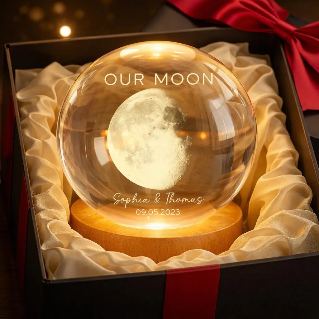 Celebrate a starry moment with this custom crystal ball LED night light, featuring a beautifully detailed moon phase design that captures the essence of your special day. Highlighting the exact moon phase from your memorable date, along with custom names and a personal message, it becomes a treasured keepsake. Designed to inspire love, awe, and a deep connection, this glowing crystal ball serves as a luminous, calming reminder of your cherished memory, making it the perfect Valentine's Day or anniversary gift for couples.