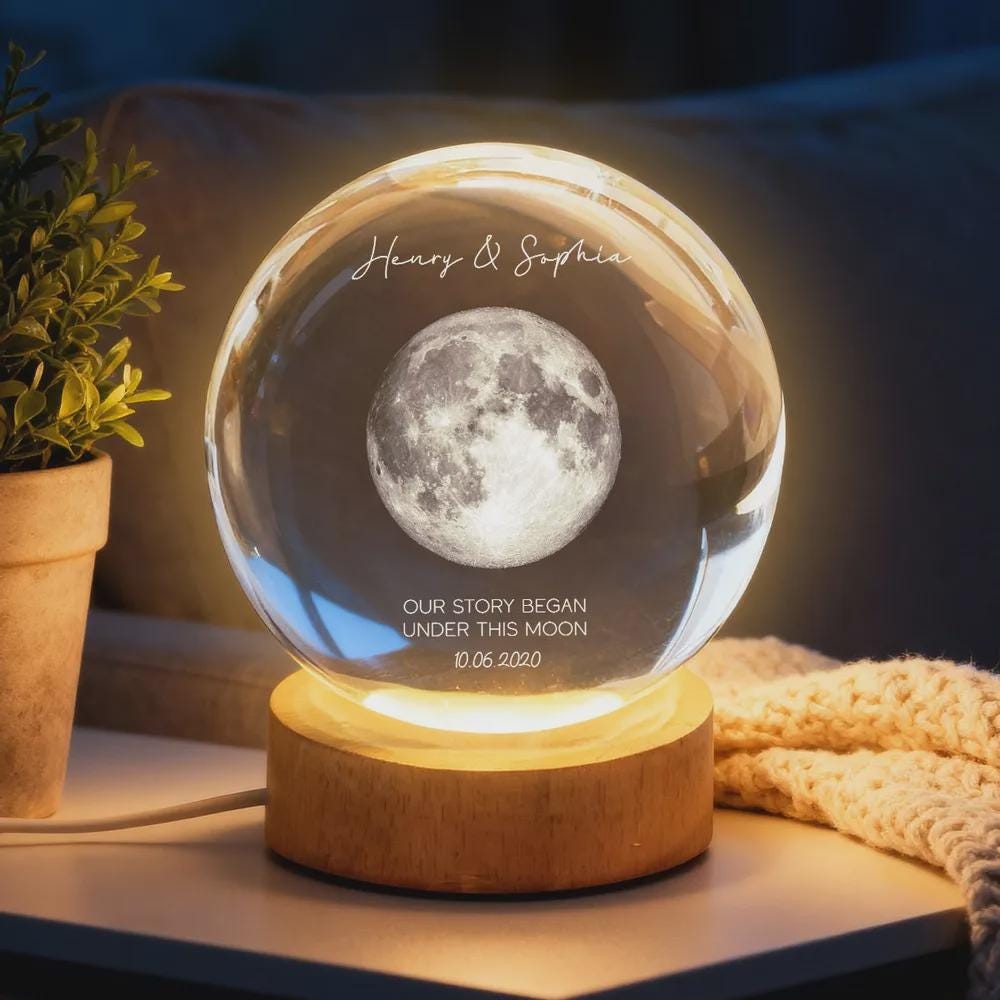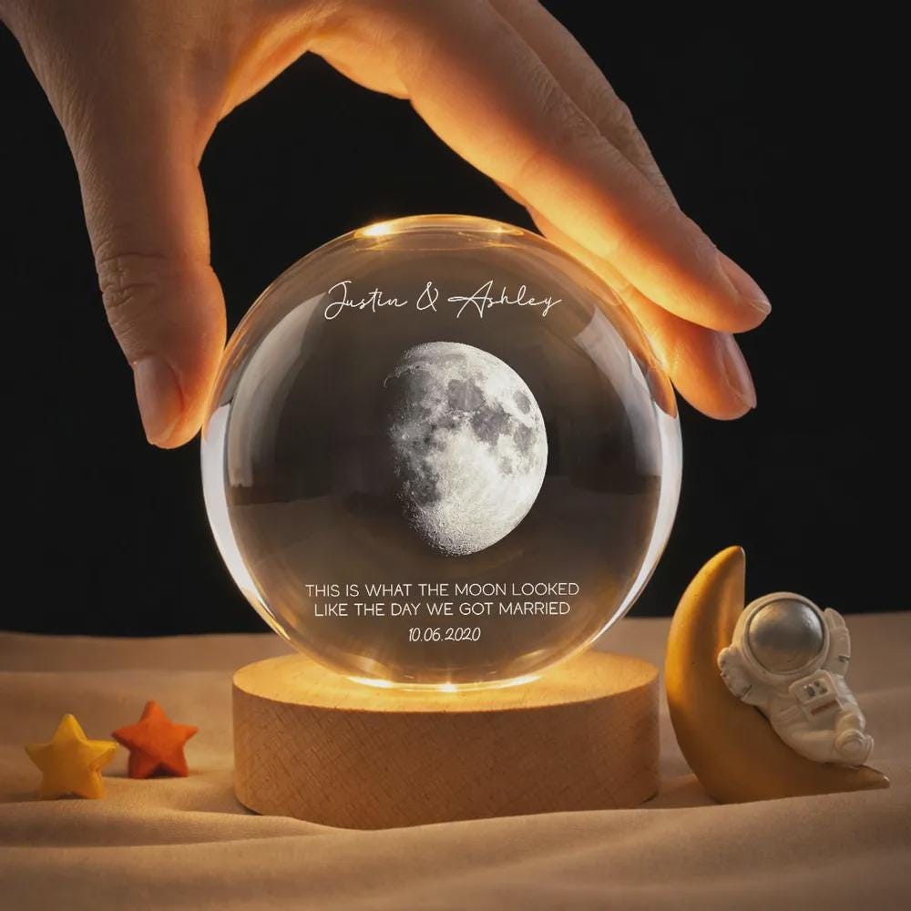 Celebrate a starry moment with this custom crystal ball LED night light, featuring a beautifully detailed moon phase design that captures the essence of your special day. Highlighting the exact moon phase from your memorable date, along with custom names and a personal message, it becomes a treasured keepsake. Designed to inspire love, awe, and a deep connection, this glowing crystal ball serves as a luminous, calming reminder of your cherished memory, making it the perfect Valentine's Day or anniversary gift for couples.
